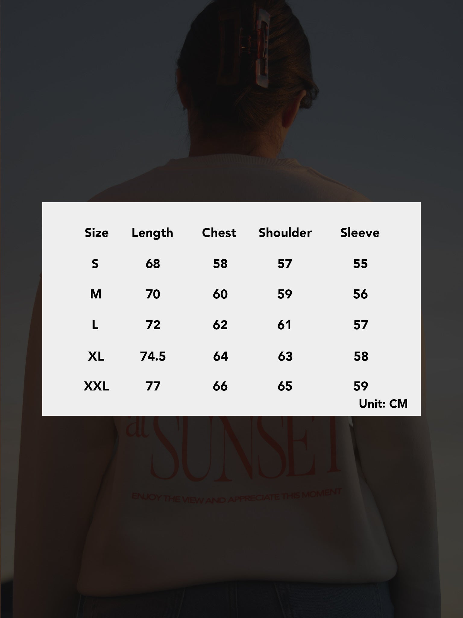 Cropped boxy fit. Recommend sizing up for a better fit if you have a long torso and/or long arms.